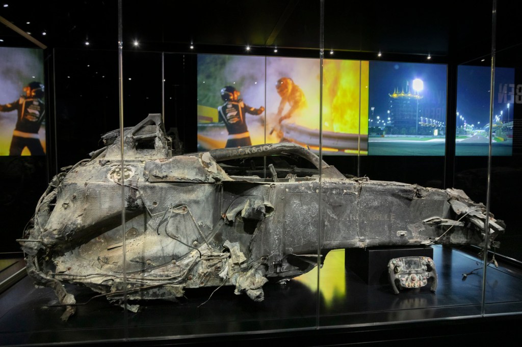 Während Show-Cars schön zum Anschauen sind, gibt es in der F1 Exhibition ein Ausstellungsstück, welches es garantiert nur ein einziges Mal auf der Welt gibt: Das Feuer-Wrack von Grosjean!